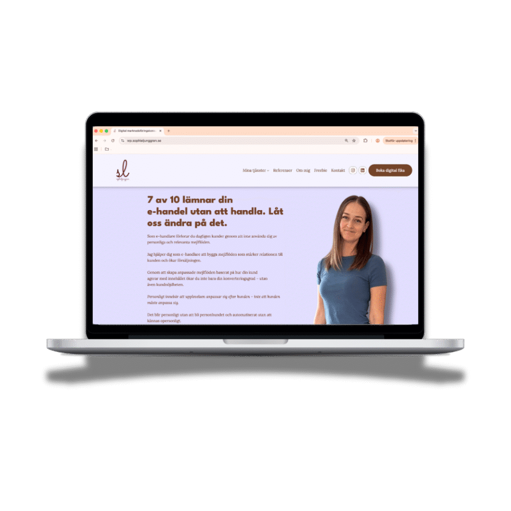 När du anlitar mig fokuserar jag både på design och strategi för att leverera en hemsida som är snygg men också lätt att använda och byggd för att guida kunden hela vägen till köp. Samtidigt lägger jag grunden för digital analys och spårning så att du vet exakt vad som fungerar och vad som kan bli ännu bättre.